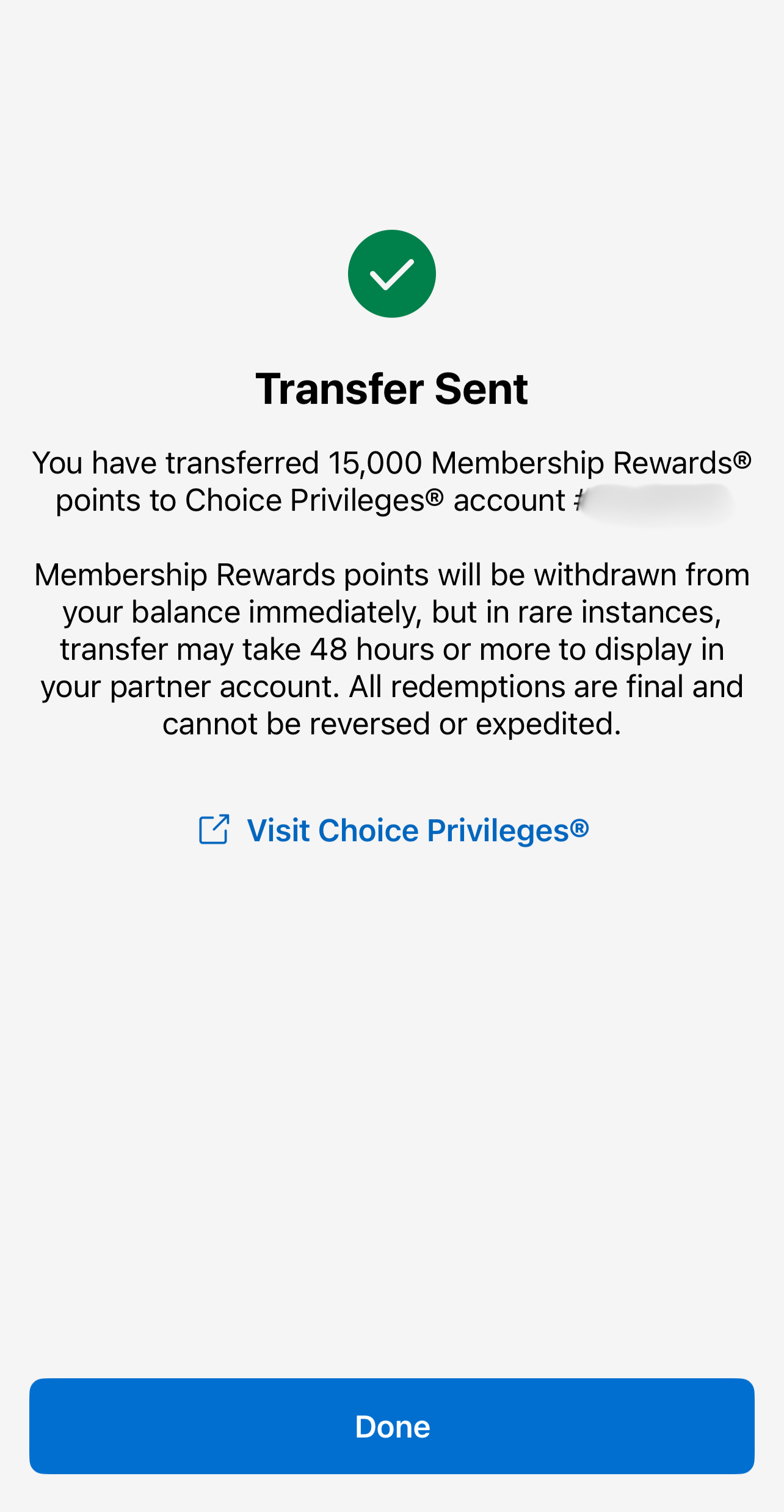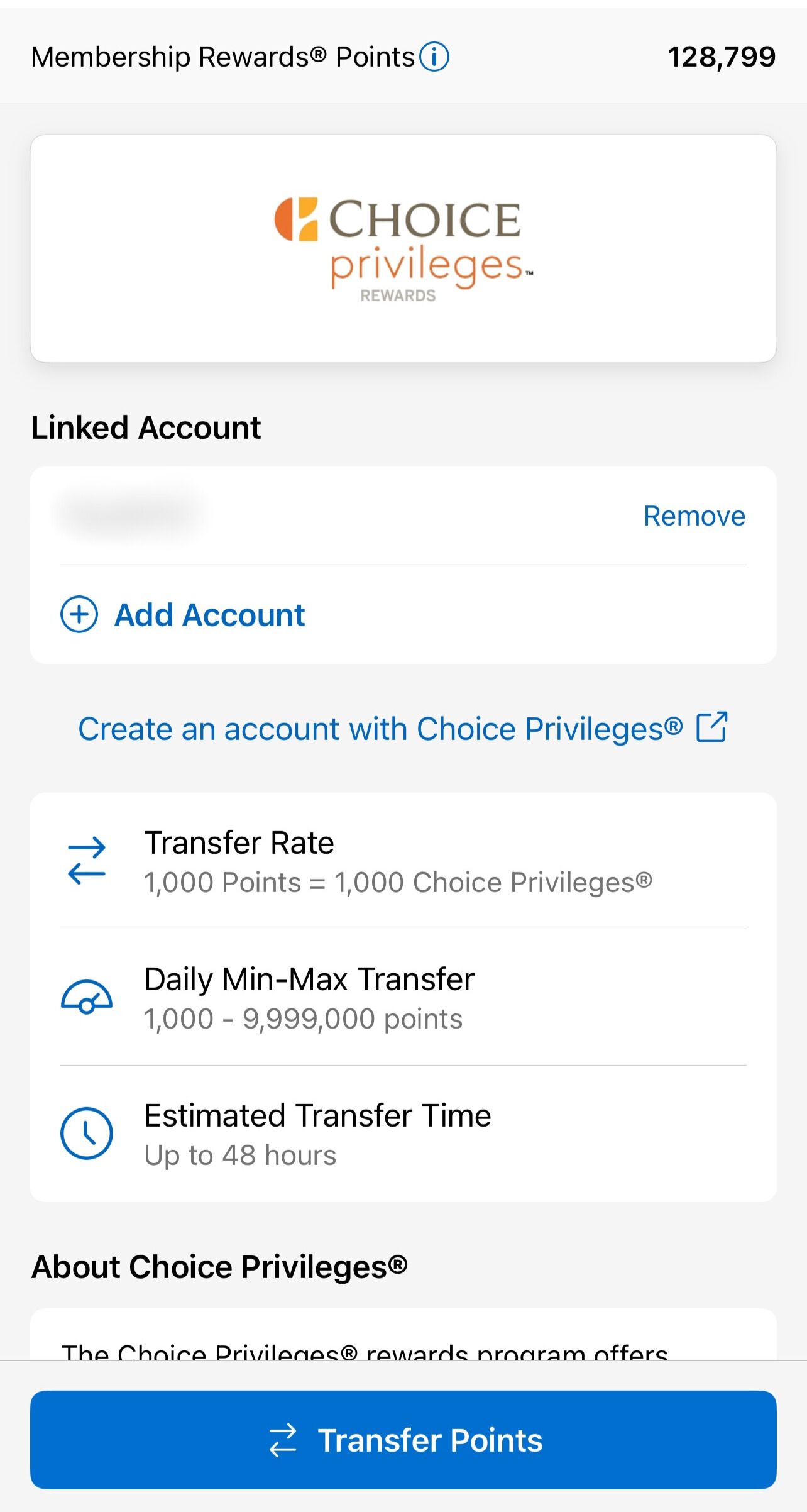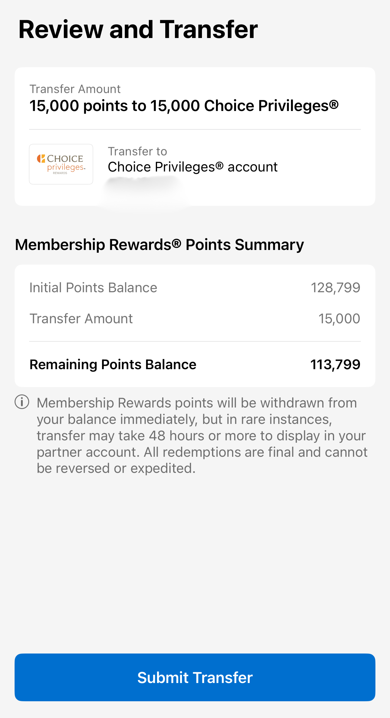 Important: The names on both accounts must match, and you’ll need your Choice Hotels membership number. Transfers are often instant but can take up to 48 hours. Be patient—my first transfer took a few hours, while the second was instant.